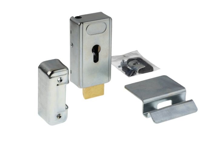Inklusive Gegen- und Bodenschließblech, wodurch die Verriegelung wahlweise zur Seite oder zum Boden erfolgen kann