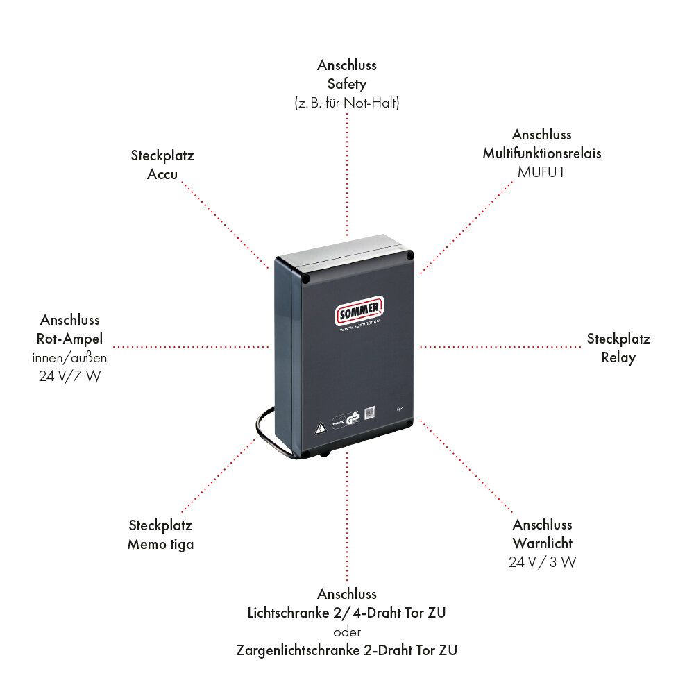 - Anschlussmöglichkeit einer Lichtschranke 2/4-Draht oder einer Zargenlichtschranke 2-Draht in Richtung Tor ZU